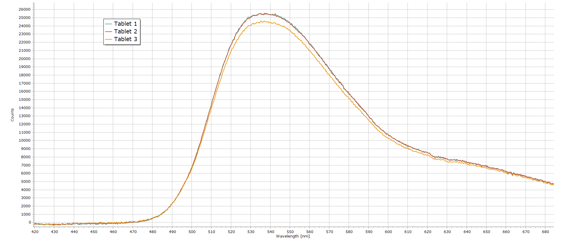 Fluorescence spectra from 3 individual tablets are reproduced here.