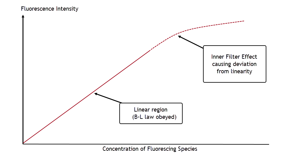 Because of this effect, a plot of fluorescence intensity versus fluorophore concentration will eventually deviate from linearity at a high enough concentration, shown in this simple schematic:
