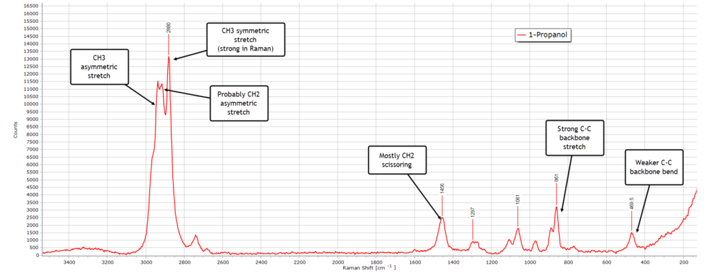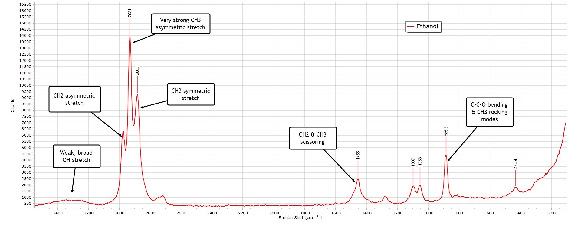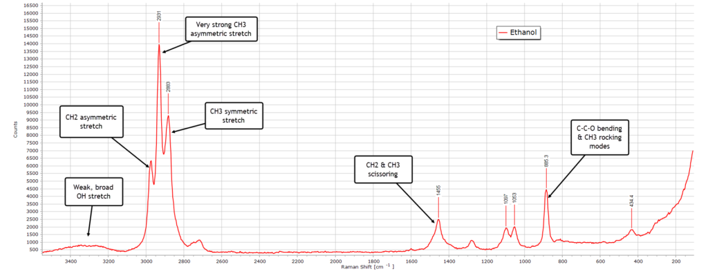 With ethanol, with only one methylene (CH2) group longer than methanol, we see an overall similar Raman spectrum, but there are some differences, largely due additional modes of vibration that this extra group adds to the C−C−O backbone.