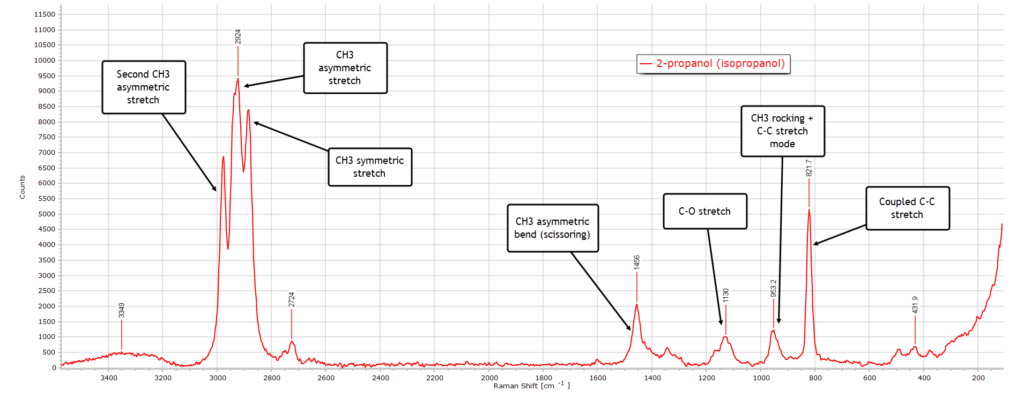 In the bending (deformation) region 1500−1300 cm-1 the CH3 asymmetric bend peak is strong since there are 2 methyl groups. The C−O stretch peak at 1130 cm-1 is very visible and the methyl rocking and C−C backbone modes. The strong peak at 822 cm-1 is characteristic for a branched (secondary) alcohol and is a good diagnostic indicator for 2-propanol.