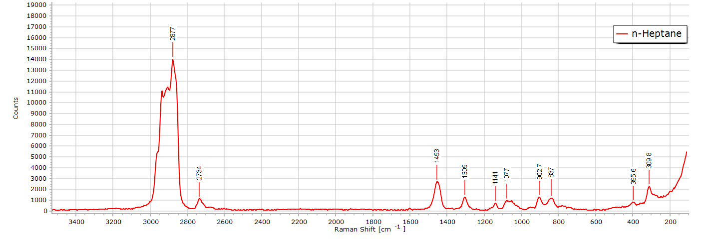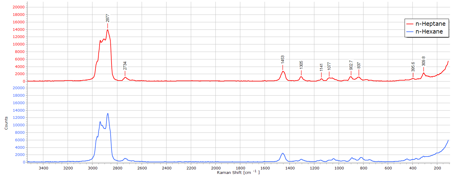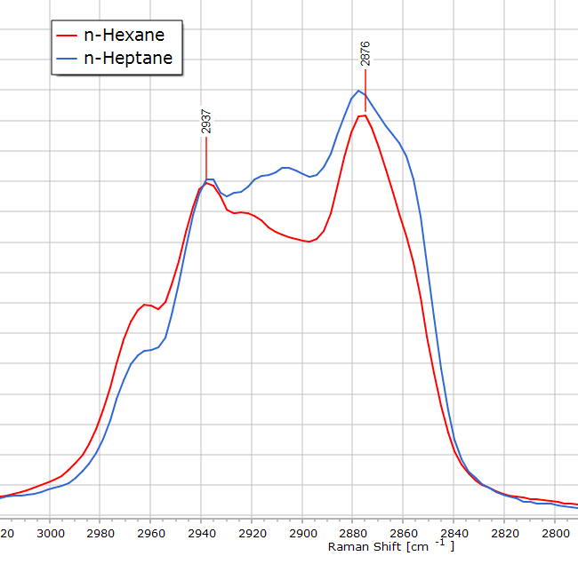 The Raman spectrum of n-heptane (C7H14) is almost identical to that of n-hexane. After all, we are only dealing with one additional CH2 group in the molecular chain length. There are, nevertheless, some subtle differences. If we stack the two spectra in software they appear almost the same: