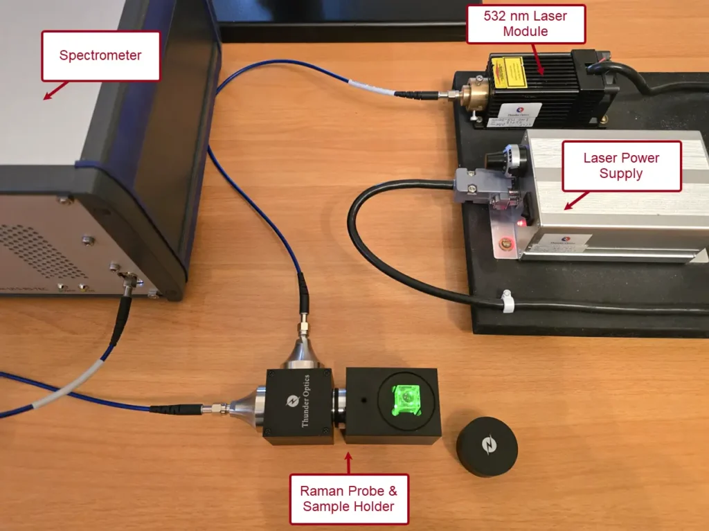 All spectra were recorded using a Thunder Optics Raman probe with a 532 nm laser described here. The basic experimental setup is shown here: