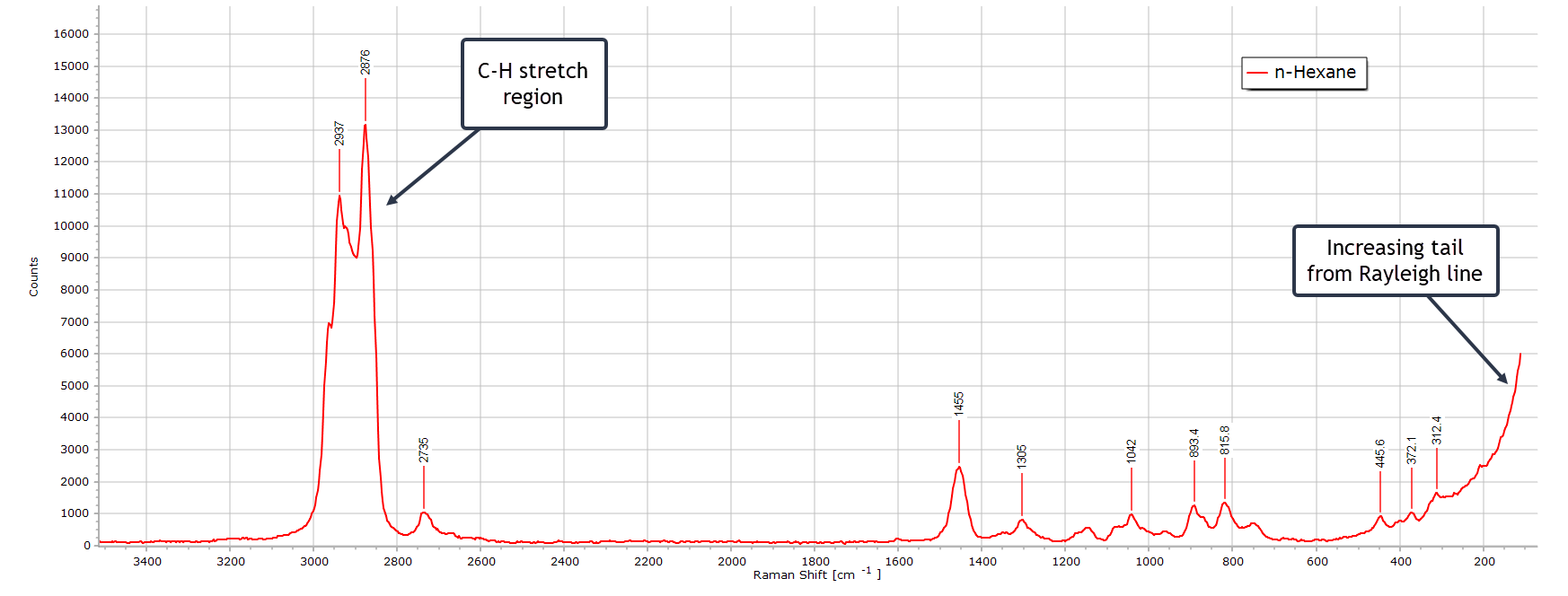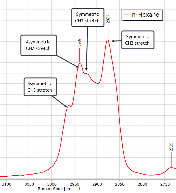 There is the very strong C-H stretching region from ~ 2850 to 2960 cm-1 as expected for a saturated hydrocarbon. The strongest band of this group is the symmetric CH3 stretching vibrational mode which is one of the strongest Raman peaks in linear alkanes.