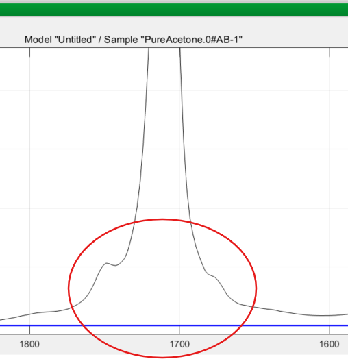 You are then asked for the number of peaks to be added, the default being one. You know from training that it is best to add a reasonable number of peaks. Even for a single measured absorption band, several model peaks may be needed to adequately model the complete envelope of the true peak. A good example is the 1700 cm-1 band of acetone which has “wings” or “tails” in the measured spectrum, clearly shown below, and you need to include these: