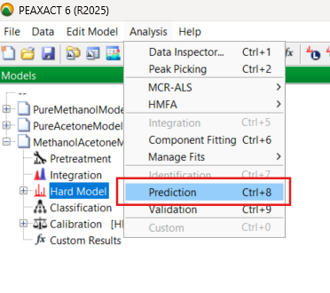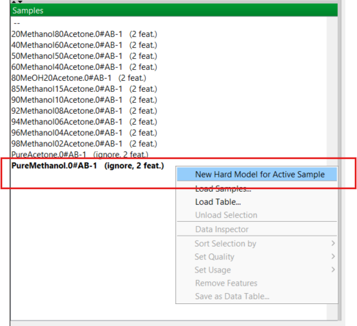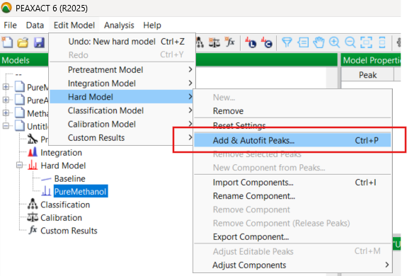 This new model is created and added to the Models Panel with the name of the sample (in this case PureMethanol) that you used. PEAXACT refers to these models as “hard” models. (A hard model in chemometrics is a model that is grounded in the laws of physics and chemistry and not just “patterns in data”. A good example would be to model absorbance using the Beer-Lambert law.)