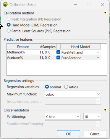 To set up the calibration, you use a Hard Model Regression with the predictive features of the pure solvent models you created earlier for both methanol and acetone. As for the regression settings, it’s best to select cubic as the maximum function for the least squares regression. This can always be changed later if a cubic polynomial equation “overfits” the data, which you want to avoid.