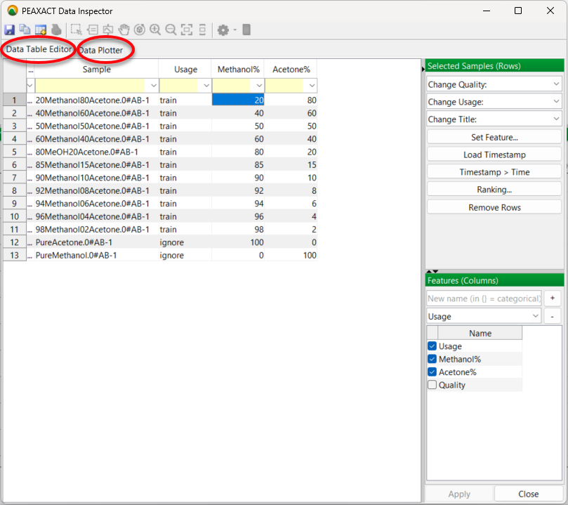 The data table has a “usage” column added. This is simply a label indicating the purpose of each sample. Mixture samples will be used to calibrate the model and PEAXACT has labelled these “train” for training samples. They are used to train the model.