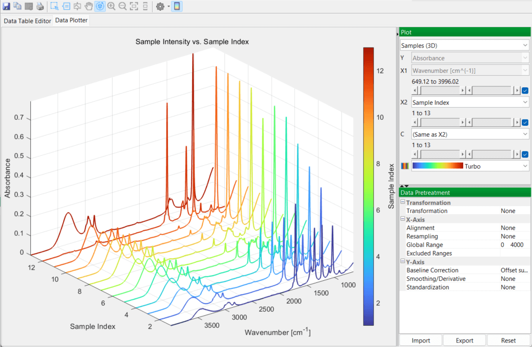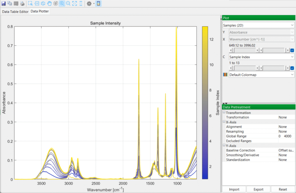 So its over to the lab to prepare these 13 samples and record individual infrared spectra for each sample. This doesn’t take too long with an FTIR spectrometer and ATR accessory. Now it’s time to input the spectra into PEAXACT. The software automatically recognises the spectrum files as coming from a Bruker Alpha spectrometer with its native OPUS software, so the spectral data import is performed smoothly without any further treatment. You now have all your spectra in PEAXACT and the data is listed in a Data Table Editor: