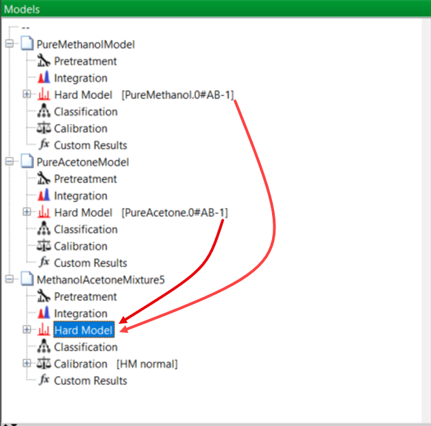From your previous training, you know that the easiest way to create the mixture model is simply to open the model “tree” for each of the pure components, methanol and acetone, and drag and drop each pure component model into a new model representing the mixtures. This new mixture model is then saved: