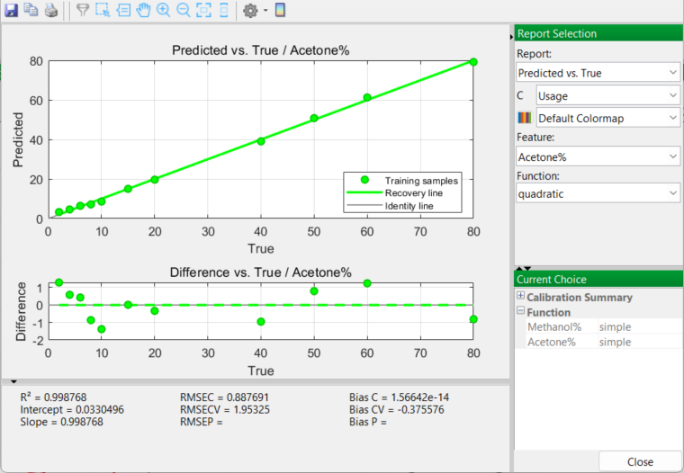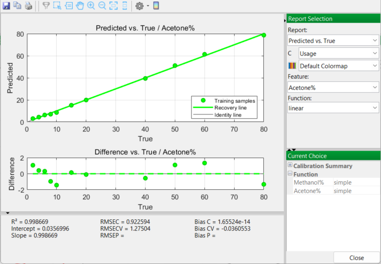 Now it’s time to check calibration and goodness of fit of this model to the actual spectra of the various solvent mixtures of the experimental design. This is carried out by running a calibration model.