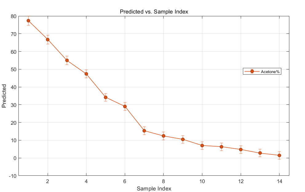 The software processes the new spectrum data and produces several plots. Focusing on acetone levels, you briefly examine the chart of the predicted values versus sample number. The error bars are encouragingly tight.