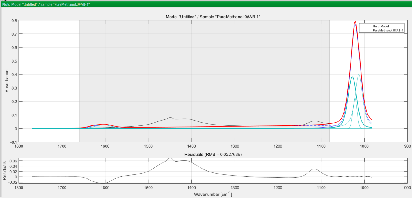 You know that the black trace is an actual recorded spectrum of one of the training samples, in this case it is a 50/50 mixture of methanol and acetone (red box). The thicker red line is the mixture model itself, used for all of the calibration samples. And again, the greyed out region is the excluded range you defined at pretreatment.