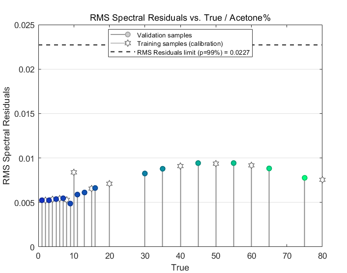 These values, all of which are less than 0.01, are much lower than the dotted line limit of 0.0227 at a confidence level of 99% that you see in the chart. Basically, the lower the residuals are here, the better the model is in fitting the data.