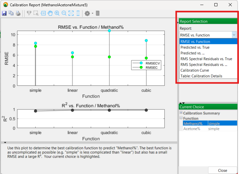 Prior to selecting a final mixture model to apply, there are a number of options to examine in this report, especially the Predicted vs. True and the Calibration Curve outputs. The RMSE (Root Mean Square Error) for each model function (linear, quadratic, cubic) is also considered.