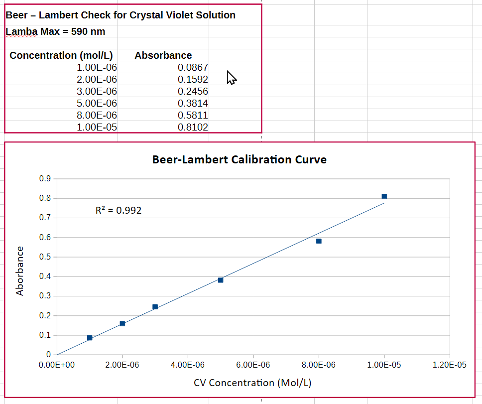 This experiment also assumes that the Beer-Lambert law is obeyed, which provides the basis for using spectrophotometric measurements in quantitative analysis. The law was described in some detail in this post, using potassium permanganate as an example. It is particularly relevant for our measurements here in this kinetics experiment, because it makes it possible to monitor and record the rate of disappearance of the dye by measuring its change in absorbance (A) as a function of time.