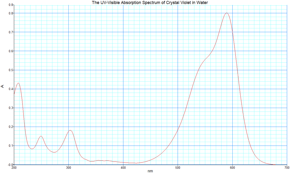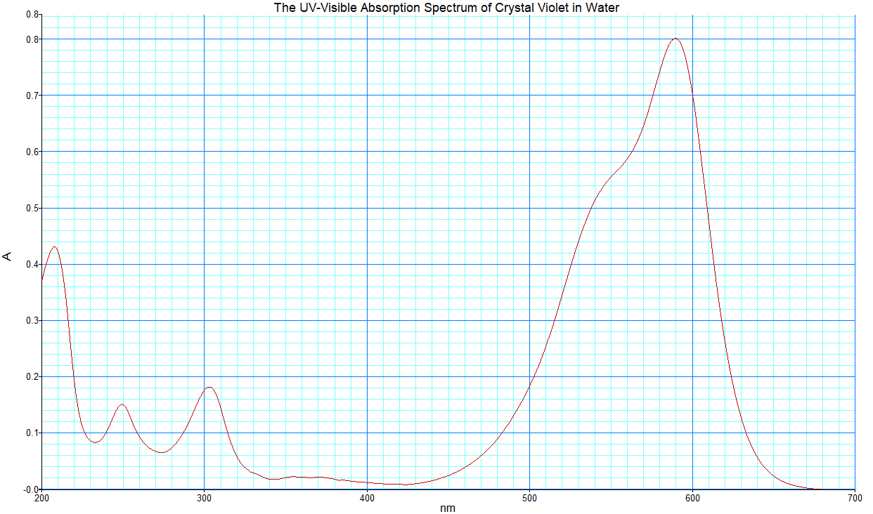 A typical concentration to use in this demonstration is from 10-6 M to 10-5 M. This ensures that the absorption falls within the linear range of the Beer-Lambert relationship. I am using a 10-5 M solution in DI water for this demo. The absorption spectrum of crystal violet across the UV and visible is shown below. The obvious strong absorption peak at 590 nm is the one we use to monitor the progress of the reaction.